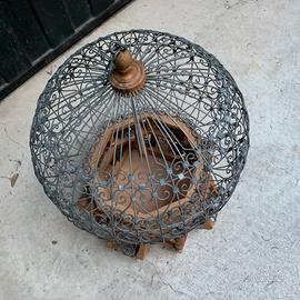 Gabbia realizzata con una combinazione di legno e metallo lavorato; base in legno strutturata e cupola in metallo lavorato con motivo decó a ricciolo