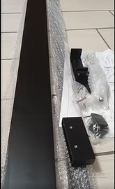 Lato interno doccia 1 ripiano forma rettangolare porta sapone, lato esterno porta asciugamani, in alluminio nero opaco, larghezza 140 cm riducibile.