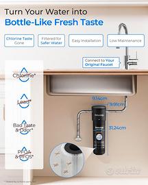 【Installazione semplice】 Il sistema deve essere collegato solo a una rete di acqua fredda. L'intero processo di installazione richiede meno di 3 minuti. Il design twist-and-lock assicura la possibilità di sostituire il filtro in 3 secondi. Il sistema include un tubo da 3/8" Il raccordo del convertitore da 3/8"–1/2" consente di collegare il sistema a linee e rubinetti dell'acqua fredda da 1/2" e 3/8".