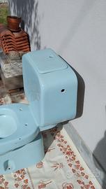 WC con sciacquone "a zaino", proveniente da bagno ristrutturato, la marca è Pozzi Ginori e la serie Square, non più in produzione. Il colore veniva denominato "Azzurro sussurrato". Le condizioni sono buone, sia del WC che della cassetta impilabile.