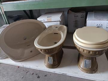Il set di sanitari, composto da LAVABO, VASO con COPERCHIO e BIDET, presenta un design marcatamente retrò, tipico degli anni '70–'80. Le forme sono arrotondate e massicce, con dettagli decorativi a rilievo sul bordo superiore che richiamano lo stile classico-moderno di quel periodo. La finitura è in ceramica smaltata con un colore marrone dorato effetto marmorizzato, abbinato a sedili e dettagli in tonalità beige chiaro.