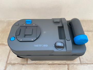 Lo sciacquone ha il pulsante elettronico stagno a incasso e funziona con pompa elettrica e collegato alla rete idrica del camper, si blocca automaticamente a risciacquo avvenuto.