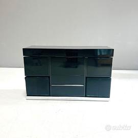Mobile bar, Willy Rizzo, il mobile scomponibile consiste in due pouf in pelle e un bar in legno laccato nero, acciaio satinato e specchio. Italia, Anni 70′. Dimesnioni cm120x40x73h