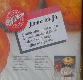 Teglia antiaderente Wilton per jumbo Muffin in alluminio di qualità per 6 Muffin giganti o cupcakes lavabile in lavastoviglie con ricette e istruzioni sul retro. Nuova e originale al 100%. Qualità garantita. Vasto assortimento di articoli per cake design in offerta per svendita.