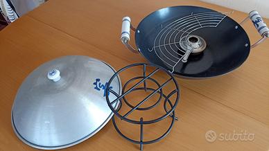 wok cinese mai usato, in alluminio, diametro cm 35. Completa di coperchio, supporto per fornelletto ad alcool in acciaio inossidabile per tenere in caldo le pietanze sul tavolo, griglia tempura e ricettario in italiano.