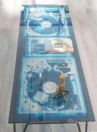 Piano in cristallo con pellicola stampata interposta e basamento in acciaio finitura Raw Black.
