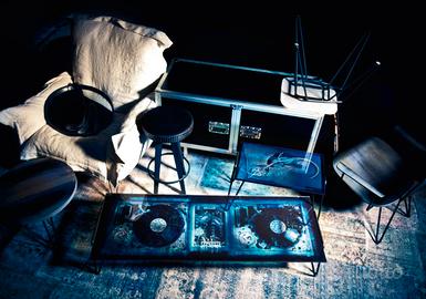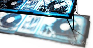 Gli x-rays di una console da dj su vetro utilizzano i colori della notte con sfumature dal blu elettrico al nero, mantenendo la trasparenza del vetro, l’effetto è forte suggestivo e molto iconografico.
