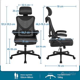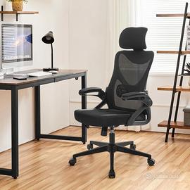 Yaheetech Sedia Ufficio Ergonomica con Braccioli Poggiatesta Regolabile Schienale Alto Funzione Dondolo Poltrona Scrivania Girevole in Rete Traspirante con Supporto Lombare Nera