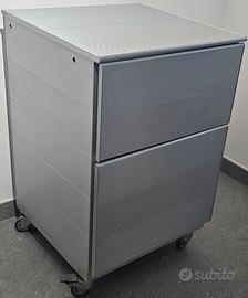 Contenitore polifunzionale realizzato in estruso di alluminio anodizzato naturale A000. Telaio strutturale in alluminio, 2 cassetti scorrevoli attrezzati internamente con 2 fondi in cristallo satinato