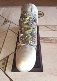 Splendida riproduzione di zanna finemente lavorata e decorata a mano. L'oggetto presenta un bassorilievo dettagliato con un dragone orientale in tonalità verde/oro, circondato da motivi floreali policromi.