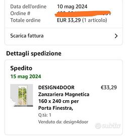 Zanzariera Magnetica 160 x 240 cm per Porta Finestra. Comprato a maggio 2024, mai utilizzato. Vendo per cambio casa. Solo ritiro.