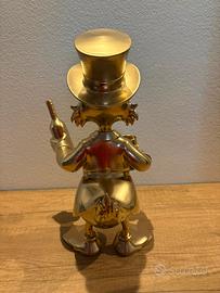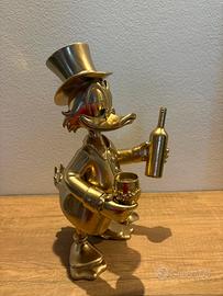Statuetta raffigurante zio Paperone con in mano un calice di cristallo e una bottiglia di vino realizzata in resina e sopra verniciata color oro lucido.