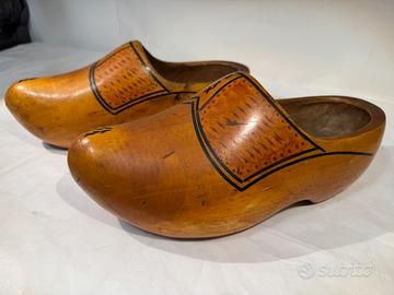 Originali zoccoli artigianali olandesi del primo ‘900 intagliati nel legno. Gli zoccoli, o clogs, nascono in Olanda tra il XIII e il XV secolo per poi diffondersi ben presto anche in Belgio, Germania, Francia e Danimarca. Realizzate completamente in legno, queste scarpe si dimostrano fin da subito molto resistenti e per questo in grado di proteggere dagli urti contadini, operai e minatori durante il lavoro.