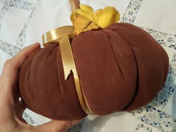 Bellissima zucca di stoffa decorata con rosa e nastri colore giallo, realizzata a mano. Handmade. ☆☆☆ Guarda anche gli altri miei annunci e risparmia sulle spese di spedizione.