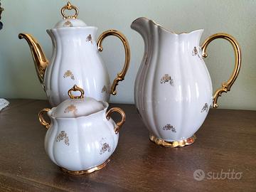 Il decoro è composto da fiorellini stilizzati a decalcomania e i manici sono dipinti a mano in oro.