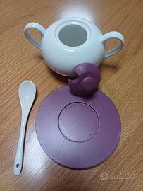 Mai usata, in porcellana bianca, con piattino e coperchietto in legno colorato.