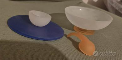 Zuccheriera (utilizzabile anche come formaggiera o contenitore multiuso) in vetro satinato completa di coperchio e cucchiaino originale.