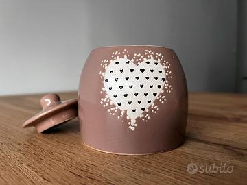 Vendo #zuccheriera in #porcellana #marrone con cuoricini decorativi. ø sup. 7,5 cm - ø inf. 9,5 cm - h 8,4 cm (senza coperchio)