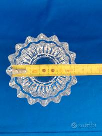 Zuccheriera o porta bonbon con coperchio, in vetro o cristallo, intagliato e con base smerlata. h 10 cm x larghezza 9 cm. Condizioni e misure come da foto.