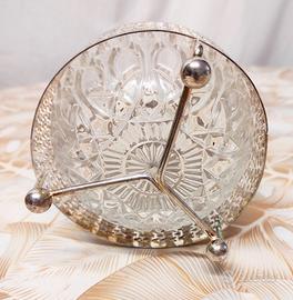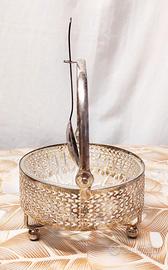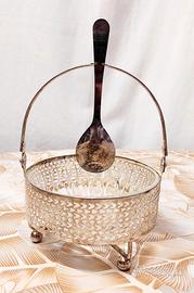 Zuccheriera (o ciotola per marmellata o formaggio) vintage in vetro trasparente con supporto e cucchiaio amovibile placcati in argento. Il supporto ha un design traforato ed è dotato di manico pieghevole e di piedini a sfera. Le parti in metallo sono da lucidare, ma si presenta complessivamente in ottimo stato. Misura 11 cm di diametro e 6 cm di altezza. La provenienza dovrebbe essere francese ma non assicuro