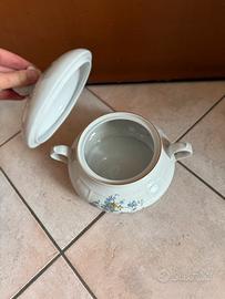 Zuppiera in porcellana, decorata con motivi floreali blu che sembrano non ti scordar di me. E un pezzo di stoviglie utilizzato per servire zuppe o altre pietanze