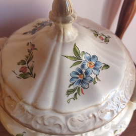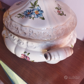 Ceramica dipinta. Altezza dalla punta del coperchio cm 25, larghezza da manico a manico cm 25, circonferenza nella parte più larga cm 65, diametro coperchio cm 18, diametro apertura superiore cm 16, diametro base cm 12