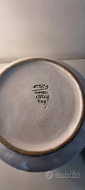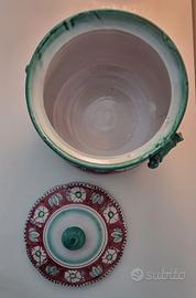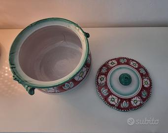 Splendida zuppiera / centrotavola in ceramica vietrese originale anni ’50, dipinta a mano e firmata sul fondo “C.T.S – Vietri Italy”. Decorazione floreale nei toni del rosso e verde, tipica della tradizione artigianale di Vietri sul Mare del dopoguerra. Oggetto autentico, non produzione recente. Completa di coperchio originale Lavorazione artigianale (pezzo unico) Ideale come elemento decorativo vintage o da collezione Dimensioni: Diametro 22 cm Altezza 14 cm