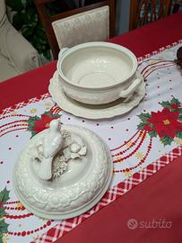 Zuppiera decorativa Palais Royal in porcellana avorio, con coperchio e uccellino, completa di piatto. Perfette condizioni.