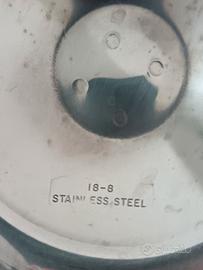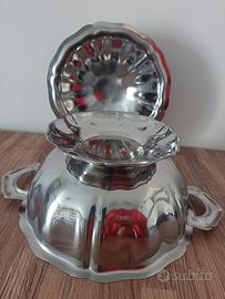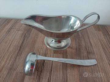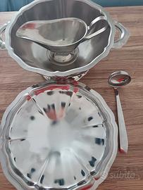Vendo zuppiera e salsiera in acciaio. Nuove. Facevano parte di un corredo nuziale degli anni Settanta. Condizioni ottime, piccolo segno sul bordo interno del coperchio della zuppiera. Zuppiera: diametro, 32,7 centimetri; altezza, 11; base, 16,5. Salsiera: lunghezza, 21 centimetri; larghezza, 9,2; altezza, 7,4 e base, 9. Mestolo: lunghezza 17,5 centimetri e coppa larga 5,5.
