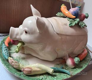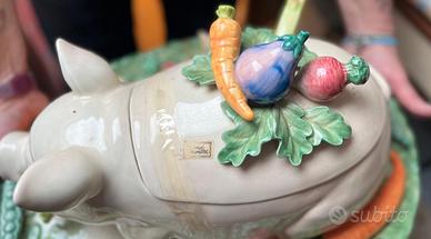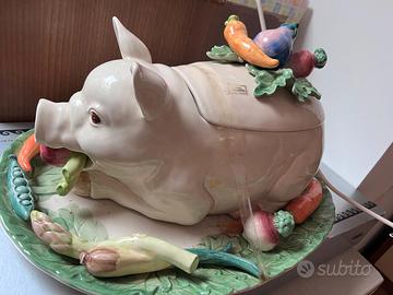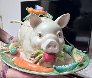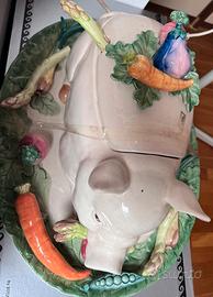 zuppiera a forma maialino in porcellana con manico a forma di asparago e vassoio con ortaggi in rilievo. capienza circa 1.5 LT, mai usata, valore commerciale 350 euro. non ha cartellino né confezione originale, è senza scatola
