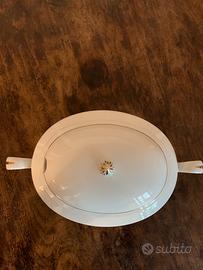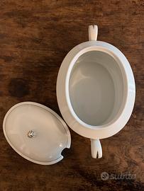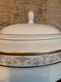 Zuppiera in ceramica bianca con decorazione nastro di fiori rosa e azzurro e ricci oro, in ottimo stato di conservazione. Misure cm. 33 X 20 altezza cm.20 circa;