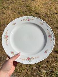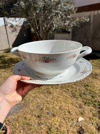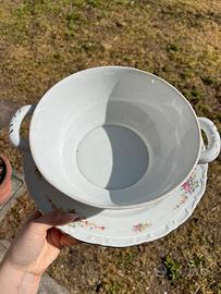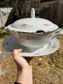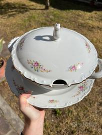 Elegante zuppiera in porcellana con piatto abbinato, decorata con delicati motivi floreali e rifiniture dorate. Completa di coperchio con apertura per mestolo, ideale sia per l’uso quotidiano che come pezzo da esposizione. In ottime condizioni, senza crepe o sbeccature. Stile classico vintage, perfetta per arricchire la tavola o per collezionisti di oggetti in porcellana. Possibilità di ritiro a mano