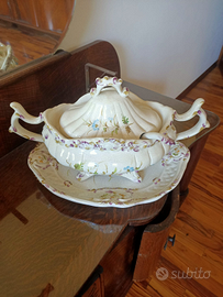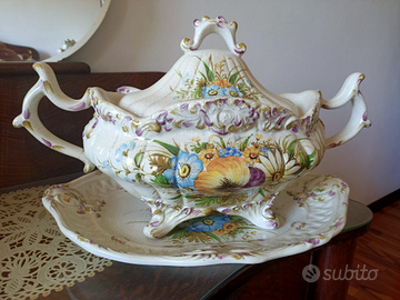 Zuppiera decorata a motivi floreali con coperchio, mestolo e vassoio in condizioni perfette vassoio lunghezza 40, larghezza 30, h 25