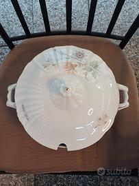 Zuppiera in porcellana vintage con coperchio dotato di spazio per mestolo. Segnalo come da foto rottura di un manico. Per il testo molto ben tenuta. Diametro maggiore superiore 23 cm