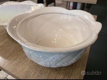 Zuppiera in porcellana, madre perlata. Mai utilizzata. I pezzi sono divisi, quindi possno essere acquistati singolarmente, solo alzatina o solo zuppiera.