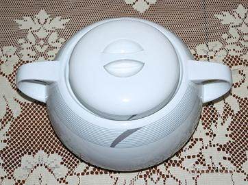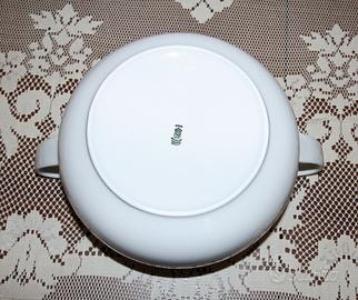 Privato vende zuppiera tonda di fine porcellana Bavaria marchiata "Schumann Arzberg Germany - seit 1881" dal design moderno, con manici, coperchio e foro laterale per mestolo, colore bianco con linee decorative.