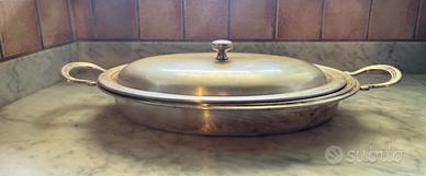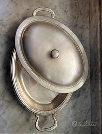 Elegante zuppiera ovale in metallo silver plated, completa di coperchio con pomolo centrale e manici finemente lavorati. Un pezzo dal fascino retrò, perfetto per impreziosire la tavola nelle occasioni speciali o come oggetto decorativo in una cucina classica o rustica.