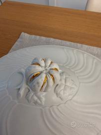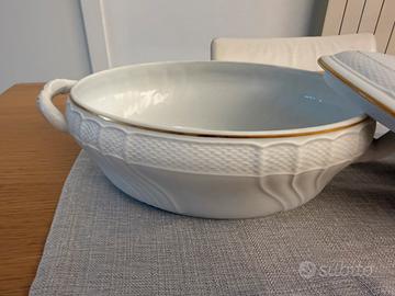 Vecchia zuppiera ovale per 12 persone, con manici e coperchio in porcellana bianca con profili in oro zecchino realizzati dalla manifattura "Richard Ginori", collezione "Sanremo" degli anni '80, modello "Vecchio Ginori". Articolo fuori produzione, in perfette condizioni (pari al nuovo).