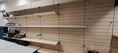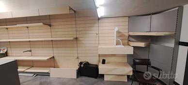 arredamento negozio mai usato completo di 9 pareti atrezzate con montanti in ferro verniciato grigio e tinta legno chiaro con base + cappello + ripiani + scanalature e ganci per blister + 2 angolari e una parete grigia piana + bancone nero 3 vani + 3 cassetti 200x60x h 90 + 2 banconi grigi con vano e ripiano e cassetti con serratura 75x60xh97 + 2 banconi grigi 2 vani con ripiani e cassetti con serratura 12x 60 x h97 + griglie 200 x 70 espositori blister e ganci ia per paret che per griglie