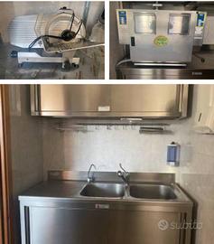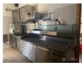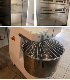 : 1 forno cimav doppio (2piani) 3+3 tegli 60x40 400V.con supporto con ruote e vano lievitazione 1 banco da lavoro inox 2mt.con doppio frigo h.90cm.e vetrina refrigerata 1 tavolo inox con alzatina h.90 da 160 e 180cm. 1 lavello inox con 2 vasche 2 pensili inox p.40 h.75 da 140 e 180cm. 1 armadio frigo doppio ilsa1400 15×80×202cm. 1 freezer iber630 -15 -25gradi 1 frigo vetrina x bibite 300lt. 60×60×200 1 vetrinetta da banco refrigeranta 3 ripiani 100lt. 1 impastatrice a spirale IGF 30lt. 400V 2 velocità 1 affettatrice inox sirman 300 inclinata 50×60×55 1 friggitrice automatica Dora 400V. 1 carrello inox 20 pioli 20 teglie alluminio 60×40 4 teglie alluminio 30×20 1 armadietto 2 ante pvc per deposito prodotti e attrezzatura pulizia 1 armadietto 2 ante per vestiario 4 tavolinetti tondi 12 sedie/sgabelli