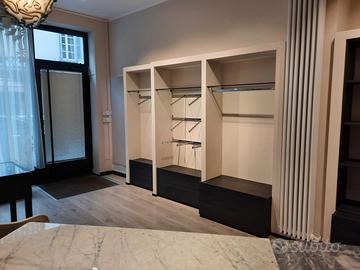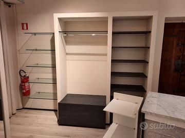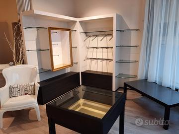 Parete attrezzata in finta muratura (n. 10 divisori), 11 cassettoni di varie misure e ripiani in cristallo. Banco sagomato cm. 140 x 120 in laminato bianco con piano in marmo. Tavoli cm. 70 x 70 e 105 x 60 con piani in cristallo. Tavolini (n. 3) e pedana per vetrina. Armadio con ante a specchio cm. 90 x 203. Camerini di prova in laminato bianco con specchi interni. Poltrona in policarbonato. I cassettoni e i tavoli sono in nobilitato rovere grigio.