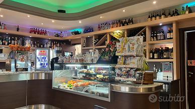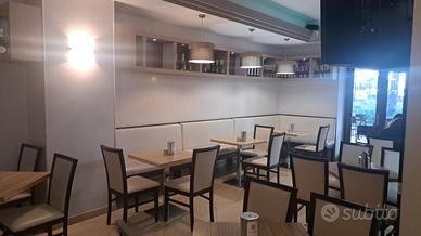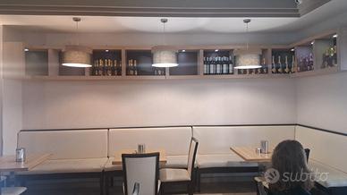 Vendiamo retro banco in legno , mensole da bar/ ristorante con sedie tavoli e divani come da foto.