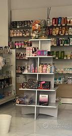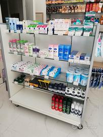 N.2 SCAFFALI AMBI I LATI ESPOSITIVI CON MENSOLE REGOLABILI E LATERALI DOGATI 126X85X140