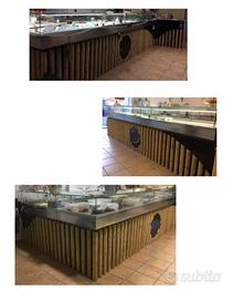 Banchi refrigerati DSL drop-in "Delice", compresi di struttura d'appoggio con regolazione di temperatura, doppio display digitale con comandi multifunzione, luci al led separate da accensione banco, regolazione interna del piano appoggio (3 posizioni). I banchi Drop-in freddo Interno banco completamente in acciaio, con vetro temperato a vista quadrato; Il drop-in caldo è in vetroceramica bianco; Lunghezza totale dei banchi mt 6.48. Banco in legno per appoggio cassa e bilancia con due ripiani al di sotto. I banchi sono completi di pannellatura esterna a vista in forex con sfondo nero e legno e pedana retrobanco in legno.