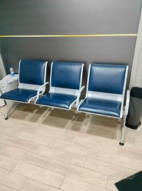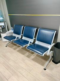 Sedute imbottite in ecopelle blu, struttura robusta in acciaio grigio con braccioli.