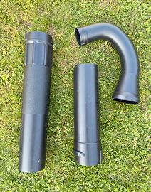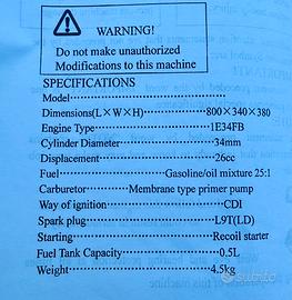 Soffiatore per giardini, con funzione anche di aspiratore per foglie e erba, con tecnologia giapponese. Piccolo e compatto, funziona a miscela, con un comodo tappo per il serbatoio. All'interno della confezione è presente un piccolo contenitore per fare la miscela, con un piccolo imbuto per facilitarne il travaso nel serbatoio. Si accende tramite CDI con una comoda maniglia. Sul manico è presente un piccolo tasto per lo spegnimento. Il soffiatore è composta da kit modulabile di tubi di aspirazione in polipropilene. Nel momento in cui si voglia usare come aspiratore, il set è dotato di una comoda sacca a tracolla, regolabile, per lo stoccaggio delle foglie/erba, con un comodo filtro a rete per il passaggio continuo dell'aria. È inoltre presente una comoda zip per lo svuotamento. Sono compresi due rapidi attrezzi per la piccola manutenzione/regolazione. L'articolo non è MAI stato usato.