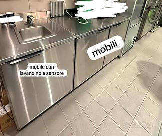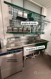 - lavello professionale in acciaio inox a 3 scomparti con rubinetto classico e rubinetto a molla, con piastra laterale per scolo e postazione lavastoviglie (lavastoviglie già venduta)