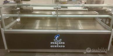 Banco espositivo OSCARTIELLE modello ZARA cm 260 x 108 con mensola in vetro ripiani in acciaio inox e riserva sottobanco refrigerata ,prezzo 5400+iva