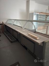 Vendesi banco frigo gastronomia professionale con vetrina espositiva a vetro curvo, espositore refrigerato e cella frigorifera positiva.