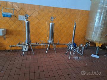 Attrezzatura per cantina sociale: - Nr.4 Fermentino in acciaio inox marca Velo spa, capacità 800 HL con sistema docce, pompe di rimonta ed elica di estrazione vinacce, Anno 1986, usato ottime condizioni - Nr.3 Fermentino in acciaio inox, capacità 400 HL, con impianto di refrigerazione completo, Industrie Fracchiola Srl Serie 1052104000 1116/1/3-2-1, anno 2004, usato ottime condizioni - Nr.1 Serbatoio in acciaio inox capacità HL 85, Nr.2 Serbatoi in acciaio inox refrigerati capacità HL 250, ottime condizioni - Filtro a cartucce inox HOUSING, come nuovo, cartucce filtranti comprese - Linea imbottigliamento marca IBT, Anno 2009, capacità 2.000 bottiglie/ora - Seconda Linea imbottigliamento Alexa Line, Anno 2009, per damigiane, - Omodei & Mena anno 2009, assemblata vari formati, tappo sughero e tappo vite completa di etichettatrice e codificatore, perfettamente funzionante - Nr.4 Serbatoi in acciaio inox marca MRS SAS, capacità HL 250, con scaletta di ispezione, usato ottime condizioni - Impianto refrigerante Diemme completo, usato in ottime condizioni - Nr.2 Serbatoi in ferro capacità 300 HL, usato buone condizioni - Svinatore a vibrazione Tecme Srl Mod.670 40034, Anno 2004, usato perfettamente funzionante - Pigiadiraspatrice Diemme Florsvin MDM 670, usato buone condizioni - Tramoggia ricezione uve acciaio inox, con doppia coclea di movimentazione, usata con accessori, ottime condizioni